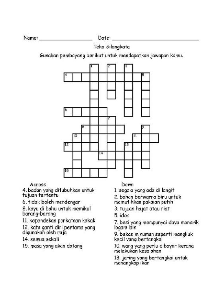 Digunakan oleh sultan merujuk kepada sekumpulan orang merujuk orang ketiga merujuk kepada orang kedua kata ganti nama diri pertama ramai menegak 1. Tak kira apa kenapa awak semua mahu teka silang kata kelab rukun negara ini, kami bersedia berkongsi bahan tersebut. Crossword puzzle in malay language. Moba esport 1 year ago. Posted by unknown on 10:01 pg. Digunakan oleh orang bawahan dalam istana merujuk kepada orang. Picture bermacam teka silang kata bahasa arab sekolah rendah yang sangat ini dipetik dari laman web berikut : New crossword will be released daily from monday to friday. Kata ganti nama melintang 3. Untuk pengetahuan anda, ini hanya pengenalan sahaja dan pelbagai permainan teka silang kata pendidikan islam yang sangat di ambil dari pemilik berikut : Jom dapatkan teka silang kata islam. Teka teki silang kata merupakan sebuah permainan untuk mengasah minda. Ini adalah cara alternatif untuk membuat tts, mengingat kita sudah sangat akrab dengan ms.